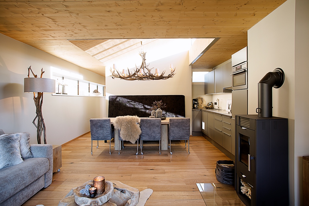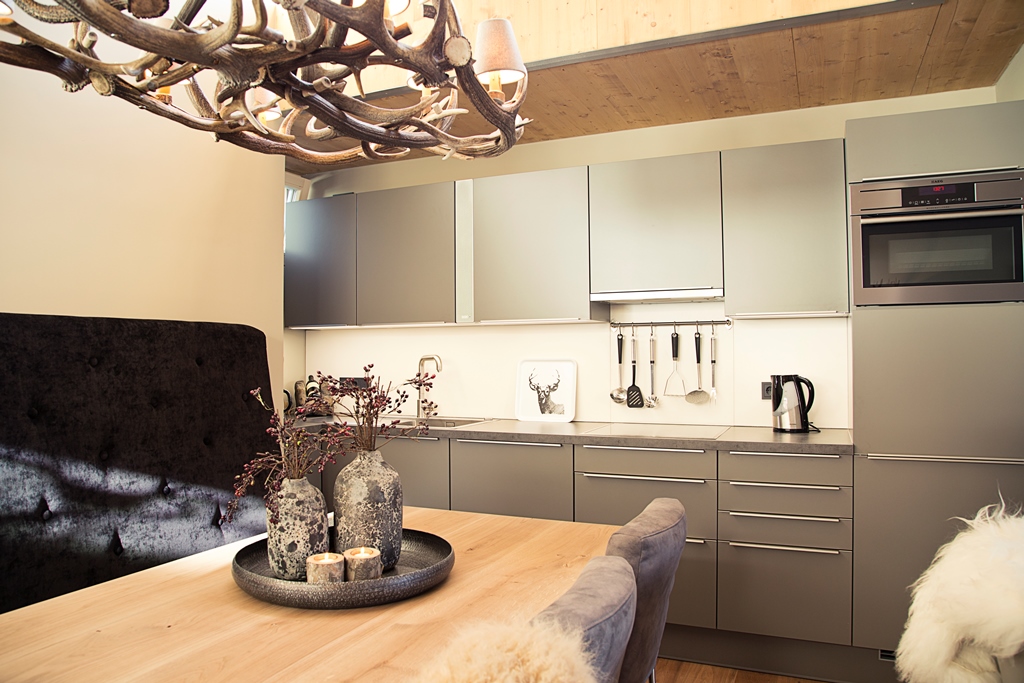 Living room with sitting area (sleeping sofa for 3 persons), fireplace and dining area. The apartment has a fully furnished kitchen with a dishwasher and a oven/microwave combination.